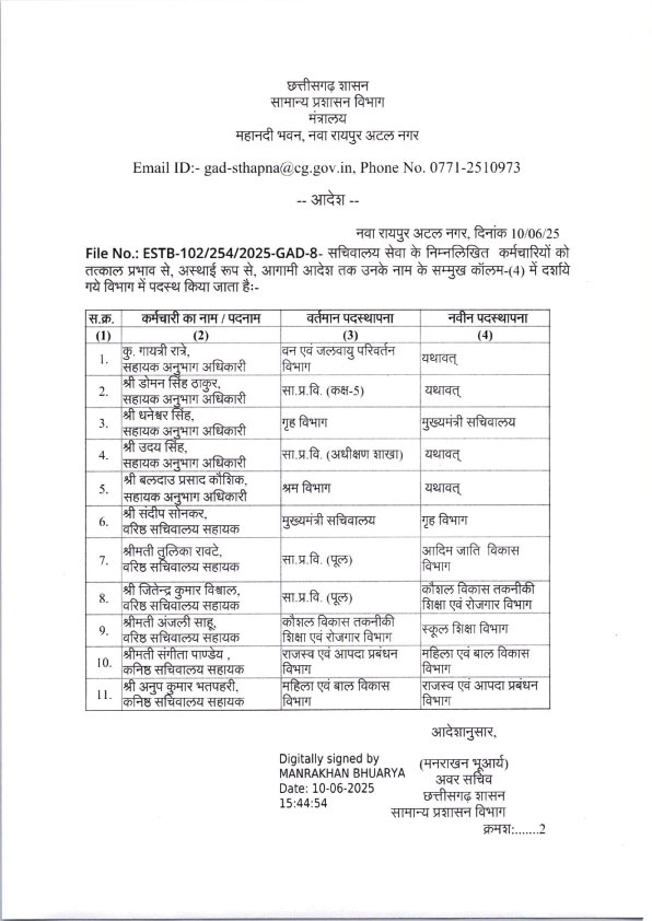 CG Transfer Breaking: मंत्रालय सेवा के 11 कर्मचारियों के तबादले